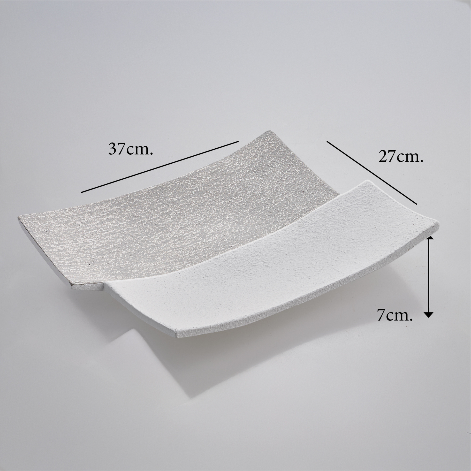 Il centrotavola “Rettangolo” in ceramica bicolore bianco e grigio unisce design geometrico e contrasto cromatico elegante.